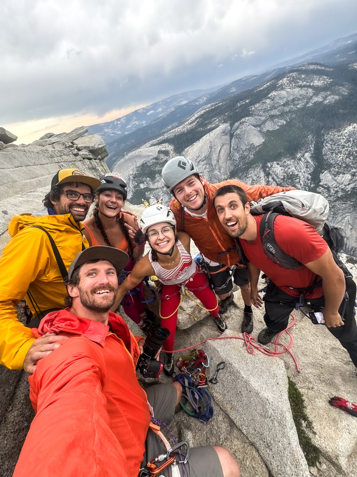 Kate: Yeah, totally. Probably the biggest thing is I got rescued off of Half Dome in a snowstorm. Yeah, the first time I attempted the double was with another SAR team member. This was before I was on the team. But we had planned to do El Cap and Half Dome in a day. And we saw that there was some weather coming in like the next night around midnight. But we were like, oh, it's a chance of rain predicted, probably fine. Like we're probably going to be around the top by then anyway. Kind of just rationalized it away. And we did the Nose in nine hours and we were super psyched. And so we're like, let's just go for it. And we like, yeah, we brought a very light puffy for the two of us and like hardshells. And we each wore leggings under our pants. That was like our prep. But we had one 60 meter rope and like one Gri-Gri and, yeah, we ended up around the chimneys on Half Dome when the storm hit. And it was much more intense at 8,500 feet than it was down in the valley. And I remember like belaying my partner in the chimneys and starting to see the snowflakes and just like hoping it was chalk, please be chalk. But it was definitely snow. And within an hour, it was just a full-on blizzard. Really really sketchy conditions, really cold and really wet. I was wearing glasses at the time, which just became completely useless. I was a little bit blind. I climbed up to the big sandy ledge wearing my gloves because my hands were so cold. And thank God we brought our approach shoes because I think like I would have gotten frostbite in my toes if it hadn't been for that.