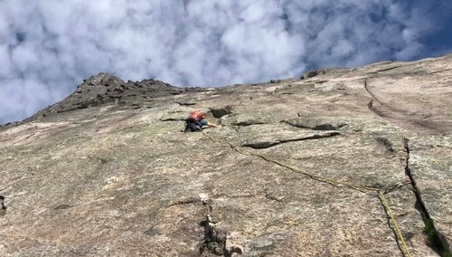 The first pitch climbs easily and it feels liberating to climb exactly where I want. After about 40 meters, I find a ledge for building a belay. I am still nervous and in too much of a hurry, and end up with a hanging belay one meter over the ledge. But oh well, the first pitch is done, and we have launched!